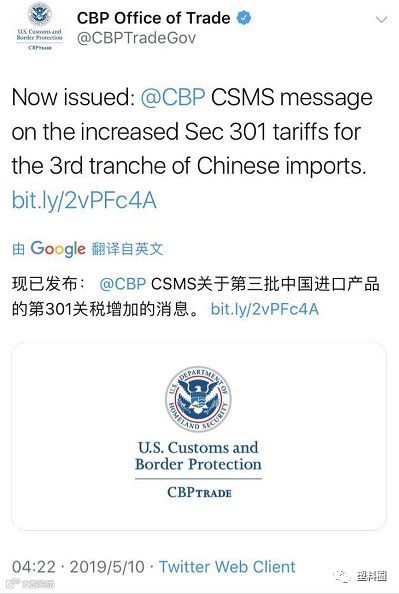 数小时前,美国海关与边境管理局(CBP)正式发布声明,将于5月10日凌晨0点,对第三批2000多亿美金的中国商品,将关税从10%提高至25%!