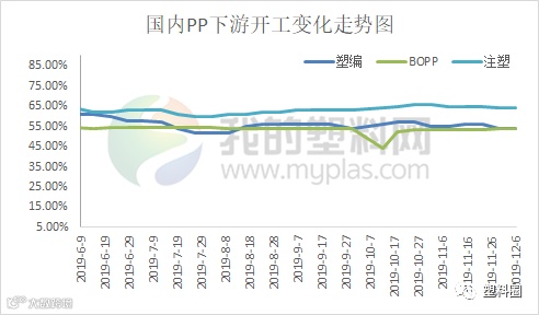 截止12月6日当周,本周聚丙烯下游企业开工率变化不大。其中塑编行业开工率在54%左右;注塑行业开工率在64%;BOPP行业开工率在53.9%左右。塑编行业原料方面工厂仍多小单补仓,整体库存中偏低位。冬季需求下滑,订单跟进放缓。