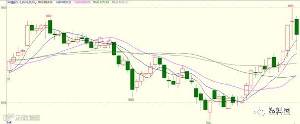 盘面情况:PP1909合约开盘8880元/吨,最低8556元/吨,最高8913元/吨,收于8715元/吨,跌120元/吨,跌幅1.36%。成交量减少至1809070手,持仓量减少30312手至550768手。技术面来看, PP1909高开震荡走低,减仓收上下影大阴线,盘面资金流出0.86亿元。MACD(12,26,9)指标中红色能量柱变短,DIFF与DEA均处于0轴上方,能量喇叭口开口略微收敛。KDJ指标在徘徊区拐头向下,形成死叉,价格上涨动能减弱。压力位9000附近,支撑位8500附近。