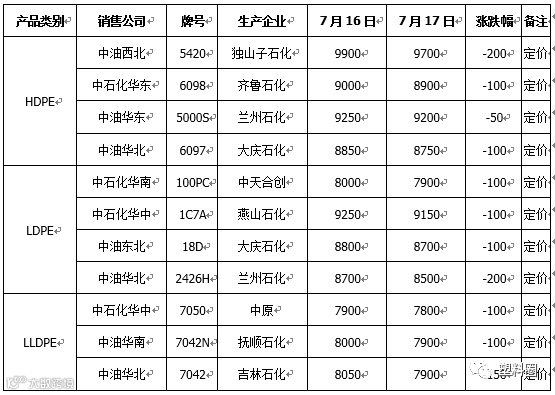 表2 石化出厂价格调整一览表(单位:元/吨)