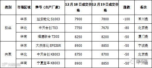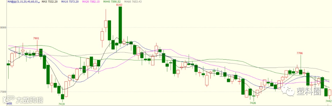 今日国内PP市场价格继续下跌,拉丝价格下跌50-100元/吨左右;部分地区共聚价格下跌50元/吨左右。价格方面,国内拉丝主流价格在7750-8100元/吨不等,低熔共聚主流价格在8800-9200元/吨不等。PP期货盘面低开震荡,对业者信心有一定打压。部分石化出厂价格继续下调,场内货源成本支撑持续减弱,贸易商依旧让利出货为主,现货市场弱势难改。终端下游观望氛围浓厚,小量刚需采购,市场交易气氛冷淡。