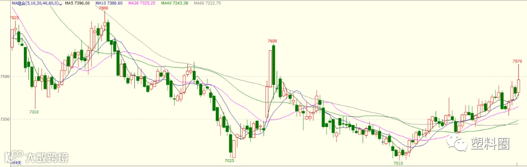 盘面情况:今日连塑2005合约开盘报7405元/吨,最高7570元/吨,最低7385元/吨,收于7480元/吨,涨75元/吨,涨幅在1.01%,成交量在368089手,持仓量减少10863手,报341983手。技术上,LLDPE2005合约平开震荡小涨。截止到收盘,资金流出2651万元,MACD指标中能量柱红柱小幅增长,DIFF线与DEA线震荡小涨,KDJ指标在徘徊区震荡走高。从均线上来看,下方测试7400附近支撑,上方关注7500附近压力,短期期价或维持在7400-7500区间震荡,建议区间交易。