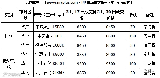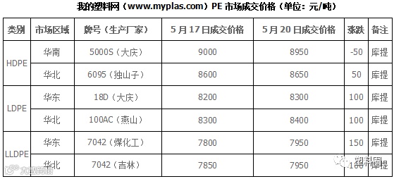 今日国内PE市场价格部分走高,部分线性涨50-150元/吨,部分高压涨50-100元/吨,低压部分拉丝及膜料品种涨50-100元/吨,其他低压品种维持涨跌。线性期货高开后震荡上扬,商家心态向好,多试探抬高报价走货,而市场买卖热情一般。部分石化大区库存累积,继续下调PE出厂价格以刺激下游买盘。终端用户询盘偏弱,部分入市采购低价货源。5月20日国内神华系列PE竞拍总量1949吨(较上一交易日增加131吨),成交率在73.32%,(较上一交易日↑8.80%),今日溢价幅度在5-220元/吨。当前国内LLDPE主流市场价格在7660-8000元/吨,LDPE主流市场价格在8000-8700元/吨,HDPE膜主流市场价格在8600-9150元/吨。