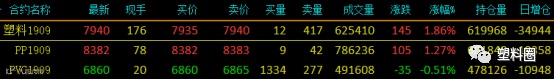 塑料相关品种期货走势分化,塑料及PP期货高开减仓收涨,PVC主力合约续涨动能不足,高开后震荡收跌。具体来看:L1909收7940涨145或1.86%;PP1909收8382涨105或1.27%;V1909收6860跌35或0.51%。