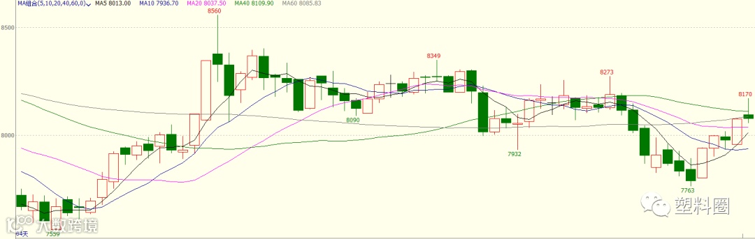 盘面情况:PP2001合约开盘8095元/吨,最低8057元/吨,最高8170元/吨,收于8077元/吨,涨55元/吨,涨幅0.69%。成交量增加至1017074手,持仓量增加46460手至7756484手。技术面来看,PP2001高开震荡整理,日内多在均线上方运行,增仓收长上影小阴线,盘面资金流入约0.204亿元。MACD(12,26,9)指标中红色能量柱变长,DIFF与DEA形成金叉后胶着前行。KDJ指标在徘徊区继续向上发散。压力位8200附近,支撑位8000附近。