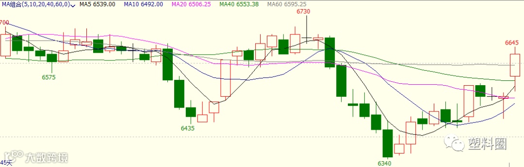 PVC2001合约开盘6565元/吨,最高6645元/吨,最低6525元/吨,收盘报6625元/吨,较上一交易涨140元/吨,涨幅2.16%,成交量增加至358686手,持仓量增加25850手至349300手。V2001期货高开后继续上行,收盘价格在年线上方,多头增仓明显,大幅放量增仓收上下影大阳线。技术面来看,MACD红柱增长,KDJ技术指标开口继续向上发散。从60分钟线来看,MACD红柱出现,DIFF向上穿过DEA,KDJ技术指标开口继续向上发散。短期下方测试6450附近支撑,上方测试6750附近压力,参与者区间交易,空单注意平仓时机。