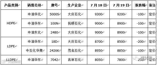 表2 石化出厂价格调整一览表(单位:元/吨)