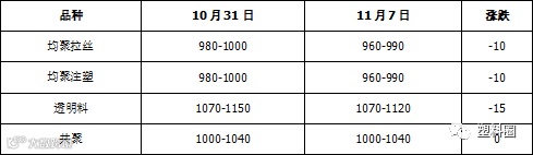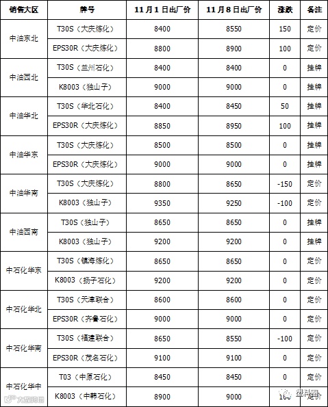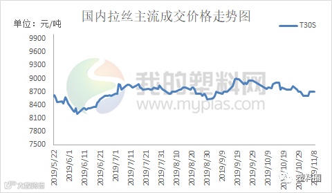 本周国内PP报价震荡整理。截止11月8日,国内拉丝主流成交价格在8350-8600元/吨不等,部分价格较上一周上涨50-100元/吨左右;低熔共聚主流价格在8980-9350元/吨不等,价格较上一周小幅涨跌50-100元/吨左右。