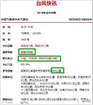 注意:8日傍晚台风“利奇马”增强到17级、其大概率在浙江中北部登陆;随着增强继续北上将影响