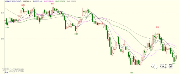 盘面情况:今日连塑1909合约开盘报7655元/吨,最高7685元/吨,最低7610元/吨,收于7655元/吨,涨25元/吨,涨幅在0.33%,成交量报348124手,持仓量减少12068手,报523928手。技术上,LLDPE1909合约小幅高开震荡上行,收十字星,盘面资金流出2042万,MCCD指标中能量柱绿柱小幅减少,DIFF线与DEA线继续向下延伸,KDJ指标掉头小幅回升。从均线上来看,下方测试7550附近支撑,上方关注7750附近力,短期期价或维持在7550-7750区间震荡,建议区间交易。