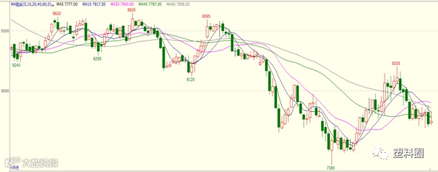 盘面情况:今日连塑1909合约开盘报7730元/吨,最高7830元/吨,最低7715元/吨,收于7745元/吨,跌50元/吨,跌幅0.64%,成交量报587370手,持仓量减少19274手,报574944手。技术上,LLDPE1909合约低开后震荡整理,收长上影小阳线。盘面资金流出3361万,MACD指标中能量柱绿柱变化不大,DIFF线与DEA继续回落,其中DEA已经跌至零轴线附近。KDJ指标在徘徊区维持震荡整理。下方测试7690附近支撑,上方关注7900附近力,短期期价或维持在7690-7900区间震荡,建议区间交易。