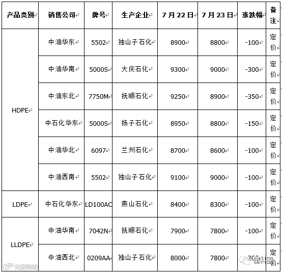 表2 石化出厂价格调整一览表(单位:元/吨)