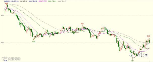 盘面情况:今日连塑1909合约开盘报8100元/吨,最高8160元/吨,最低7980元/吨,收于8005元/吨,跌115元/吨,降幅1.42%,成交量报761666手,持仓量增加18854手,报598472手。技术上,LLDPE1909合约低开后震荡回落,收小阴线,盘面资金流入2252万,MACD指标中能量柱红柱缩短,0轴线上方DEA线继续提升,DIFF线小幅回落。KDJ指标在徘徊区向下拐头。下方测试7900附近支撑,上方关注8200附近压力,短期期价或维持在7900-8200区间震荡,建议区间交易。