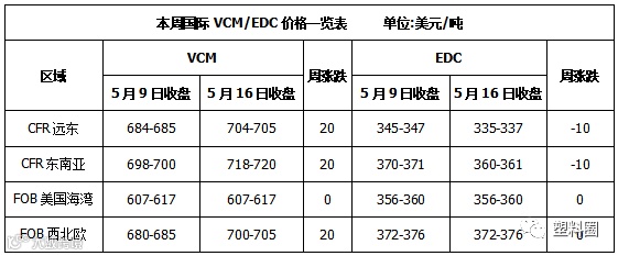 VCM:本周亚洲地区报盘上调,CFR远东报盘上调20美元/吨至704-705美元/吨,CFR东南亚报盘上调20美元/吨至718-720美元/吨。亚洲PVC市场行情良好,提振VCM市场,因此亚洲VCM市场报盘上涨。