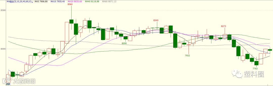 盘面情况:PP2001合约开盘7992元/吨,最低7937元/吨,最高8017元/吨,收于7978元/吨,涨22元/吨,涨幅0.28%。成交量减少至663998手,持仓量减少19226手至727556手。技术面来看,PP2001高开震荡整理,减仓收小阴线,盘面资金流出约0.4196亿元。MACD(12,26,9)指标中绿色能量柱变短, DIFF与DEA在0轴下方,处于弱势区域,能量喇叭口逐渐收敛。KDJ指标在徘徊区形成金叉后,继续向上发散。压力位8100附近,支撑位7800附近。