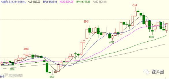 盘面走势:PVC1909合约开盘6855元/吨,最高6950元/吨,最低6825元/吨,收盘报6945元/吨,较上一交易涨35元/吨,涨幅0.51%,成交量减少至396336手,持仓量增加11060手至489186手。V1909期货在日间盘有所反弹,日内基本在均线上方运行,多头力量增强,尾盘站上10日均线上方,缩量增仓收下影中阳线。技术面来看,MACD绿柱缩短,KDJ技术指标在徘徊区域有形成金叉趋势。从60分钟线来看,MACD红柱出现,DIFF向上穿过DEA,KDJ技术指标在徘徊区域形成金叉后拐头向上发散。短期下方测试6800附近支撑,上方测试7100附近压力,参与者区间交易为主。