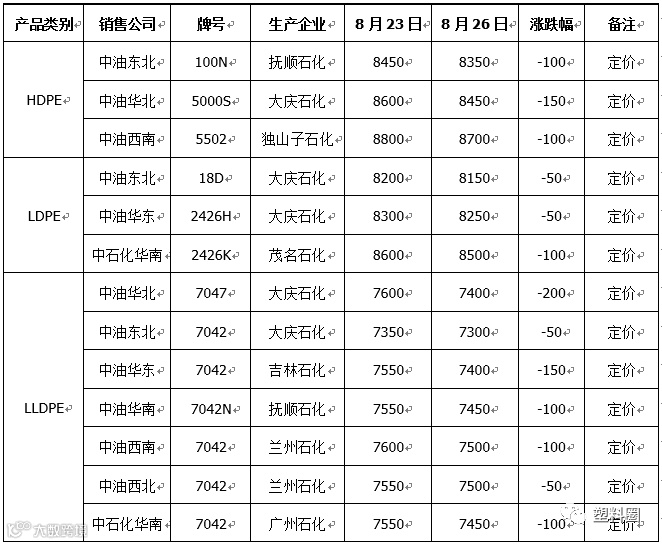 吨。石化方面部分出厂价格下调