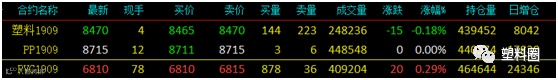 受益于经济数据表现较好,塑料相关品种期货一度拉涨上行。但持续性有限,主力合约冲高后回落,各品种小幅涨跌不足50点。具体来看:L1909收8470跌15或0.18%;PP1909收8715平;V1909收6810涨20或0.29%。
