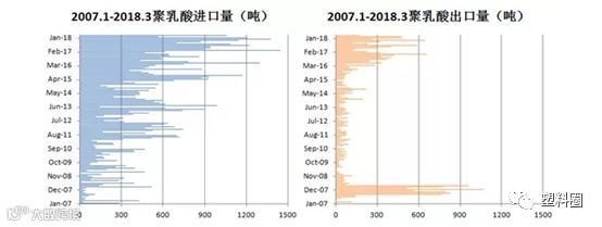 2007年至2008年初期,中国聚乳酸主要用于出口,国内需求小;2008-2015年期间出口量较为稳定,国内需求稳步增长,推动进口量不断增长;2015-2018年期间,中国新建/扩建聚乳酸项目相继释放产能,且产品质量受国际市场认可度越来越高,出口量明显上升;2017年来聚乳酸进口量的明显增加,显示出中国聚乳酸市场增长开始提速。