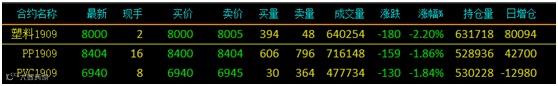 连塑L1909合约创近两年以内新低,开盘报8160元/吨,最高至8175元/吨,最低至7970元/吨,收于8000元/吨,跌180元/吨,跌2.20%,成交量报640254万手,持仓量增仓80094手,报631718万手。技术上,LL1905合约大幅增仓收长下影长阴线,5日均线上方压制, KDJ指标形成做空信号, MACD指标绿柱微变长明显。小时线来看,上方均线继续压制K线,并且日线及小时线K线实体都已从下方脱离均线,形成缺口,预计连塑短线或有修复跌幅现。