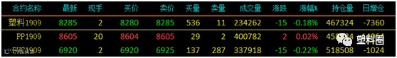 临近假期,塑料相关品种期货波动幅度收窄,各品种减仓调整。其中塑料及PVC继续收跌,PP主力合约勉强收涨。具体来看:L1909收8285跌15或0.18%;PP1909收8605涨2或0.02%;V1909收6920跌15或0.22%。