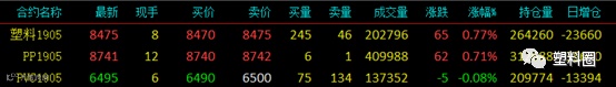 主力逐步移仓换月,近月塑料相关品种期货涨势放缓,其中V1905高开回落,放量增仓收小阴线。具体来看:L1905收8475涨65或0.77%;PP1905收8741涨62或0.71%;V1905收6495跌5或0.08%。