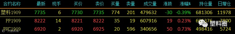 连日来破位大跌,塑料相关品种期货存在技术上修复需求。今日各品种期货低开或平开后震荡走高,终于结束前期连续收阴的局面。其中PP及PVC主力合约小幅收涨,L1909多空博弈激烈,小跌收盘。具体来看:L1909收7735跌30或0.39%;PP1909收8222涨19或0.23%;V1909收6920涨50或0.73%。