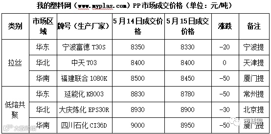 今日国内PP市场延续下调,价格方面,拉丝主流价格下调幅度在50元/吨左右;部分地区共聚价格下调幅度在50-150元/吨左右;国内拉丝主流价格在8350-8500元/吨不等,低熔共聚主流价格在8750-9400元/吨不等。今日PP期货盘面低开震荡走高,虽然暂缓现货下跌速率,但对业者心态提振不明显;贸易商对后市恐跌心态未有明显改观,主动让利出货为主。石化出厂价格多数下调,场内货源成本支撑持续减弱,进一步打压市场价格。石化库存量仍处于高位水平,下游企业按需采购为主,实盘成交未见明显放量。