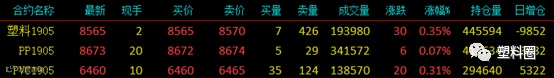 节后第四个交易日,石化库存仍处于高位,今日多数大区出厂价格多数下调,批量优惠、指导价下调等政策也较为普遍。商家跟跌报盘,今日塑料现货市场延续跌势,各品种价格走低50-100元/吨不等。目前下游工厂逐步开工,部分试探性入市询盘,但买涨不买跌心态表现明显,除必要刚需小单采购外,多不急于入市,场内观望情绪浓厚。期货方面,经过连续三个交易日的大跌,今日低开震荡上行,日内小幅收涨。具体来看:L1905收8565涨30,涨幅0.35%;PP1905涨6,涨幅0.07%;V1905涨20,涨幅0.31%。
