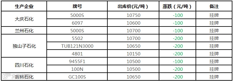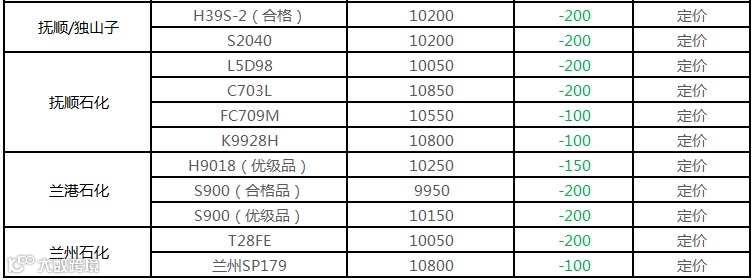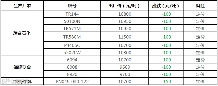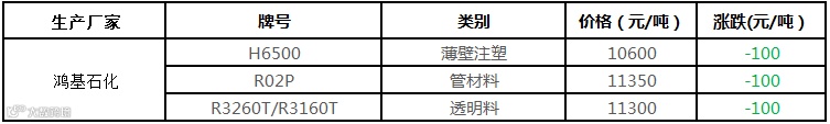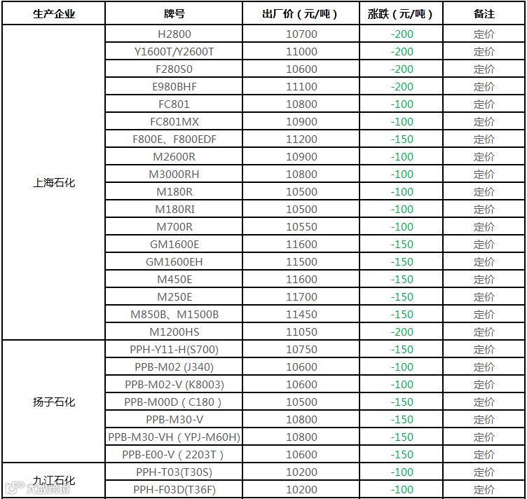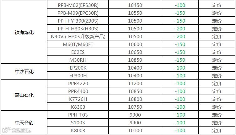 中化泉州炼厂PP价格下调100元/吨:其中L5E89报价在10450元/吨福建送到,L5E89-GD暂停报价,L5D98福建送到价格在10450元/吨,LH7714-12暂停报价,H5380R-1暂停报价。此外,潮汕地区送到需加501元/吨运费。