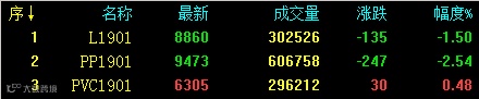 今日塑料相关品种期货走势分化,V1901小幅收涨,L及PP主力合约大幅收跌。其中PP1901增仓下破,居于商品跌幅榜第二位。具体来看:L1901收8860跌135或1.50%;PP1901收9473跌247或2.54%;V1901收6305涨30或0.48%。