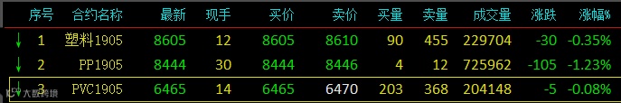 延续昨日下跌趋势,今日塑料相关品种期货继续下行,但品种间强弱分化仍相对明显。具体来看:L1905低开震荡收跌,下方40日均线处尚有支撑,日内增仓收长下影小阳线;PP1905低开低走,增量增仓下行,日内收长下影阴K线;V1905表现相对强势,平开突破昨日高点之后掉头向下,日内多数时间维持在均线下方运行,尾盘微跌,日内减仓收上下影中阴线。