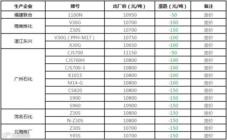 中石化华南PP部分定价下调50-150元/吨!!!