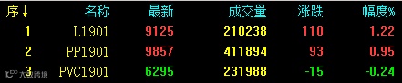 国内商品期货收盘走势分化,黑色系领涨,能化产品除个别稍弱外其他表现尚可。塑料及PP主力合约继续修复基差,高开震荡日内收涨。V1901增仓小跌,收取三连阴。具体来看:L1901收9125涨110或1.22%;PP1901收9857涨93或0.95%;V1901收6295跌15或0.24%。