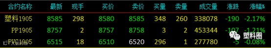 尽管铁矿石方面开市封涨停板,但是塑料相关品种期货并未如愿迎来“开门红”行情。在开盘冲高之后,塑料及PP主力合约震荡走低,其中L1905增仓大跌收取长阴线,再度考验60日线附近支撑。具体来看:L1905收8585跌190或2.17%;PP1905收8757跌107或1.21%;V1905收6515跌5或0.08%。