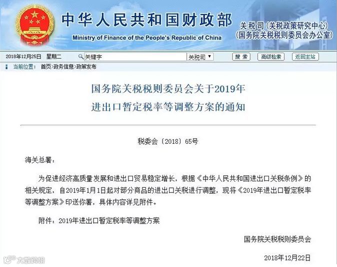 12月24日,财政部发布了《国务院关税税则委员会关于2019年进出口暂定税率等调整方案的通知》。