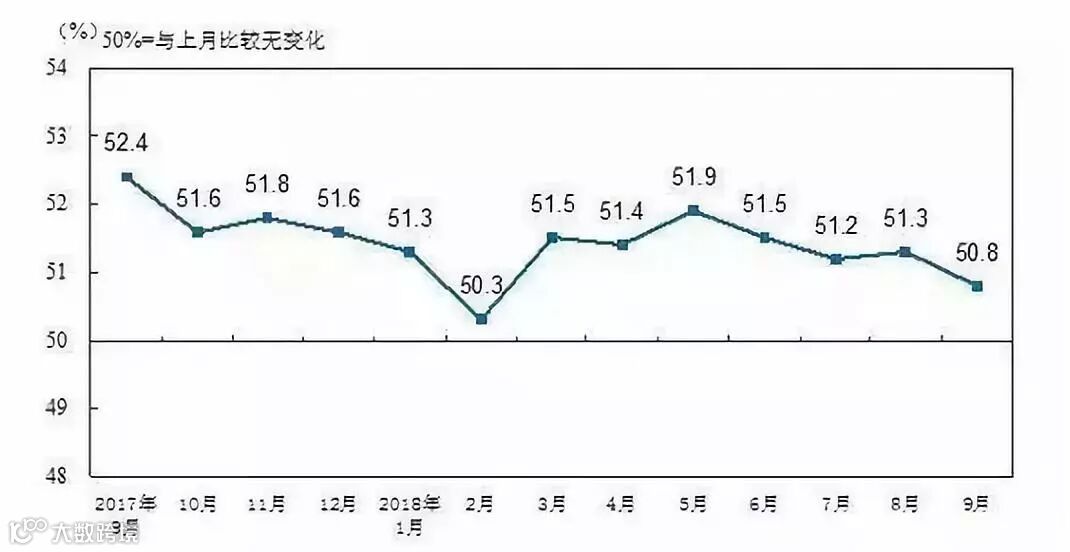 从数据中,我们可以明显看到17年9月以来,我国制造业的PMI指数一直是呈波动下降态势的。 而在九月,制造业的PMI指数仅为50.8。 要知道如果PMI指数接近于收缩指数(低于50)是十分危险的!