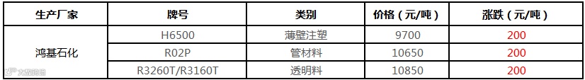 鸿基石化PP价格上涨200元/吨