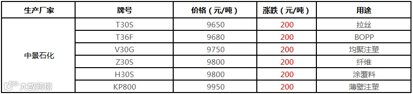 中景石化PP出厂价格下调200元/吨