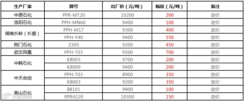 中石化华中PP部分定价上调100-700元/吨!!!