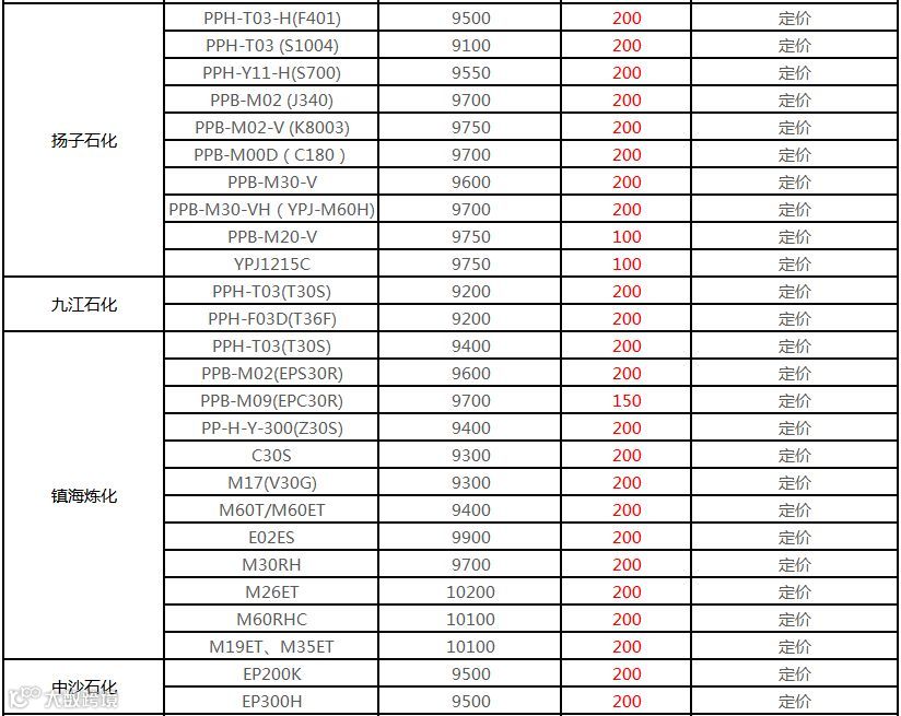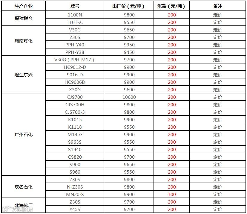中石化华南PP部分定价上调100-200元/吨!!!