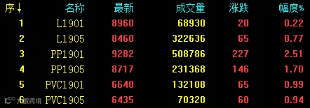 商品期货多头氛围浓厚,今日期货涨多跌少。其中黑色系期货收盘领涨,螺纹、热卷涨4%。郑醇、PTA、焦炭、线材涨逾3%,苹果、铁矿、锰硅、纸浆涨逾2%。塑料相关品种期货继续全线收涨,其中PP品种继续大幅走高,近月合约最高逼近9300,尾盘站稳20日均线,减仓上行收取4连阳。具体来看:L1901收8960涨20或0.22%;L1905收8460涨65或0.77%;PP1901收9282涨227或2.51%;PP1905收8717涨146或1.70%;V1901收6640涨65或0.99%;V1905收6435涨60或0.94%。
