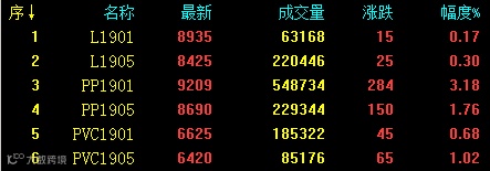 G20峰会传出中美暂停升级贸易限制的消息后,市场情绪转暖,工业品期货连续第二天强势上涨。午后内盘期货涨跌不一表现分化,黑色系及其他工业品大面积收涨,郑醇盘中一度涨停,但农产品期货普跌。塑料相关品种期货继续全线收涨,其中PP近月合约增仓上涨,突破20日线最高至9234。期价连续走高,对于现货市场提振明显。具体来看:L1901收8935涨15或0.17%;L1905收8425涨25或0.30%;PP1901收9209涨284或3.18%;PP1905收8690涨150或1.76%;V1901收6625涨45或0.68%;V1905收6420涨65或1.02%。