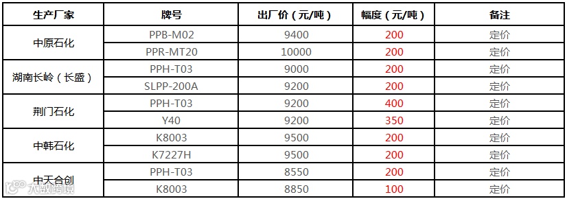 中石化华中PP部分定价上调100-400元/吨!!!
