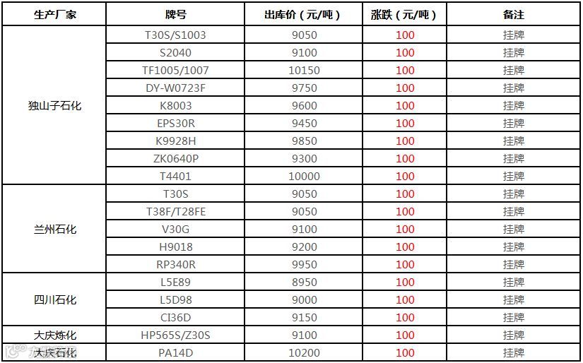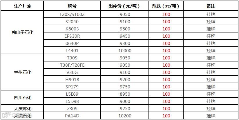 中油西南PP挂牌价格上调100元/吨!!!