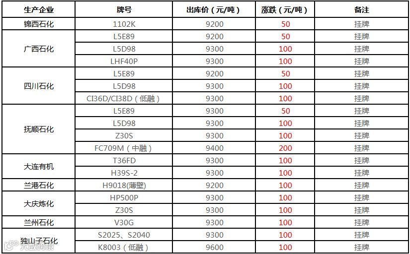 中油华南PP挂牌价格部分上调50-200元/吨!!!