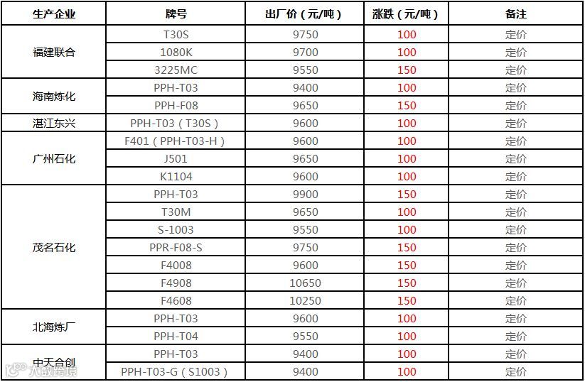 厂家挂牌价格上涨200元/吨:其中PPR-M600及PPH-M600X均报价在9600元/吨挂牌,PPR-M700挂牌价格在10400元/吨。山东联泓PP装置年产能为20万吨,正常生产。