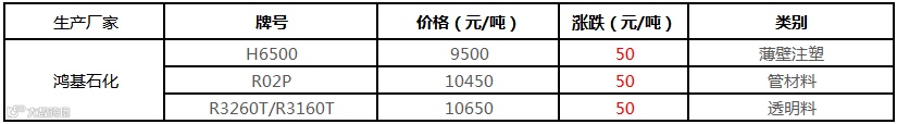鸿基石化PP价格上涨50元/吨