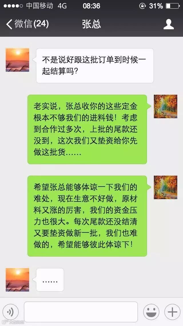 5 、所以在开始合作的时候,要敢于提要求,不要怕做不成这单生意,过度放低底线失去原则,最后结果是人财两失!我们敬重珍惜每一位及时结账的客户,即使量不大,对质量要求高,但能及时结账就是最大的信誉和财富!信誉,是一个人,一个公司,发展来源!