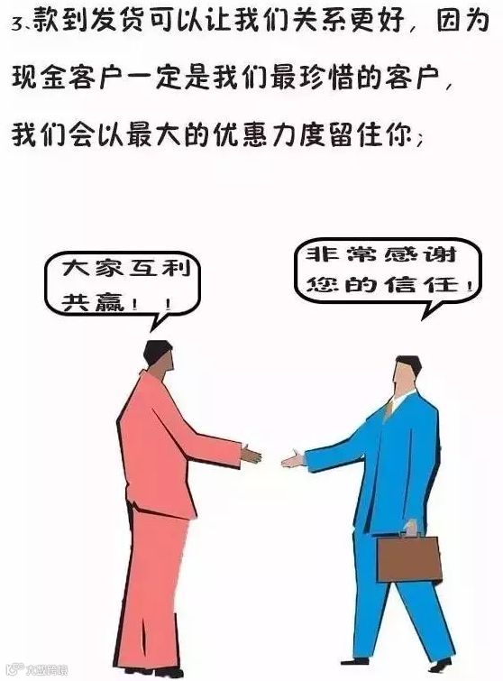 3、 款到发货可以让我们关系更好,因为现金客户一定是我们最珍惜的客户,我们会以最大的优惠力度留住你;